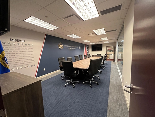 Description: This design-build project involved the renovation of an existing conference room at the MLK Building for the U.S. Marshals Service. The scope included selective demolition, new partitions, ceiling grid installation, lighting upgrades, electrical rough-in and finishes, flooring replacement, and painting. Additionally, the existing kitchen cabinetry was replaced, and the work was performed with minimal disruption to building operations. The renovation provided an upgraded, functional, and modernized conference space to support agency needs.