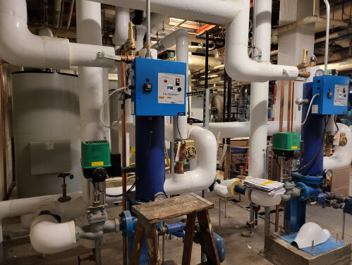 Description: The project involved the replacement of two 1,125-gallon steam domestic hot water heater tanks. Scope included removal and disposal of existing tanks and associated piping, asbestos testing and abatement, and installation of a new domestic steam hot water tank system. The work included new valves, regulators, steam traps, insulation, and recirculation pumps. A temporary hot water system was provided to support ongoing building operations. All work was performed in accordance with NFPA, NEC, ASME, ASTM, and USACE EM 385-1-1 standards, with proper documentation and disposal procedures maintained to meet all regulatory requirements.